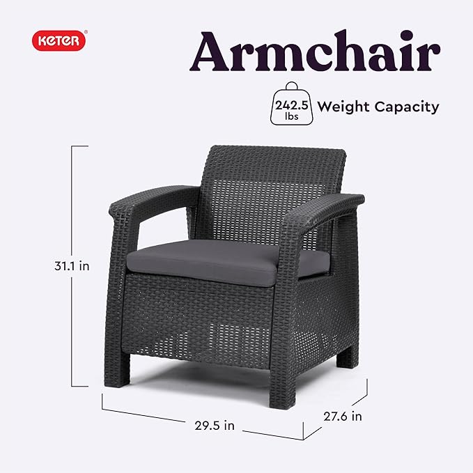 Keter Corfu 4 Piece Set All Weather Outdoor Patio Garden Furniture with Cushions, Charcoal