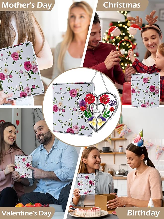 KY&BOSAM Heart Suncatcher Friend Stained Glass Hangings for Windows Real Flower Glass & Metal Maker Sun Catchers Birthday Gifts for Frined Home Party Backyard Indoor Outdoor Decor Christmas Ornament