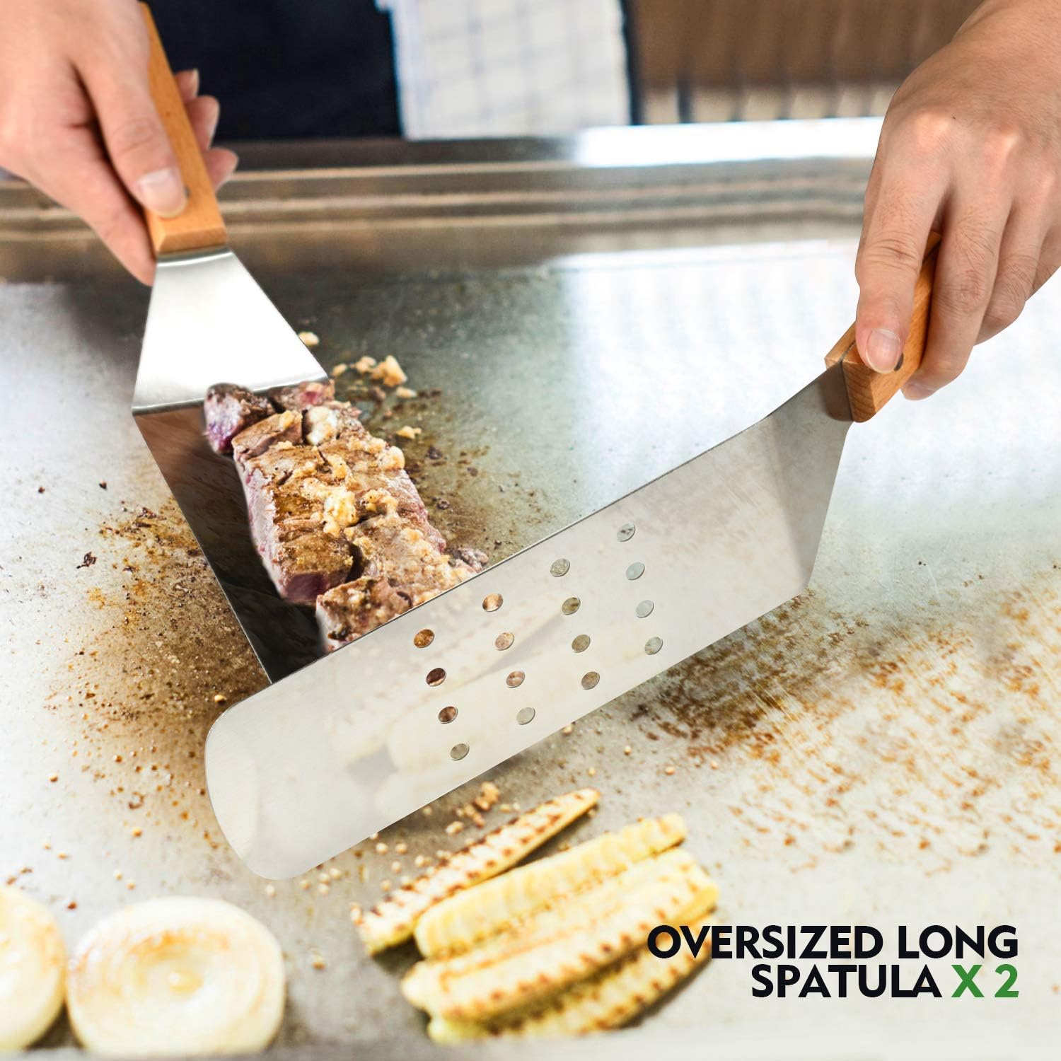 - 🔥【Multipurpose Outdoor or Kitchen Cooking Kit】2 Oversized griddle spatulas, great for flipping beef cubes, fried egg, rice, noodle and vegetables. 2 Regular size grill flippers/turners (can be use as shorter spatulas) with 3-sided bevel cutting edge, great for turning burger,pancake and cutting bread,meat and sausage.
