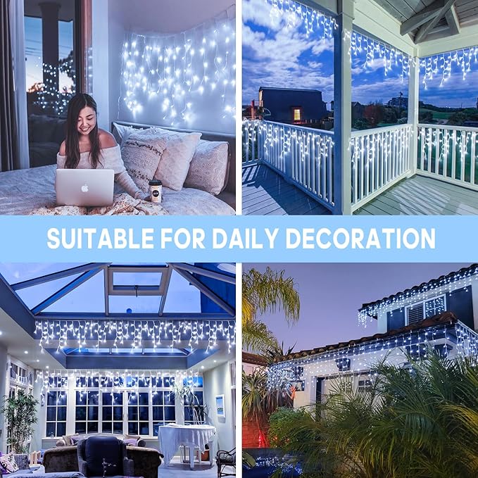 - 【Valentines & Wedding Decorations】Give your Valentine's Day and wedding celebrations into a magical with our white icicle string Lights. Perfect for creating a romantic ambiance, white lights drape elegantly before the backdrop or the tents, casting a nice glow. Whether it's a cozy dinner for two under the stars or a grand wedding reception, our wedding lights add a touch of enchantment, making every moment unforgettable. Light up your special day with the perfect blend of elegance and warmth.