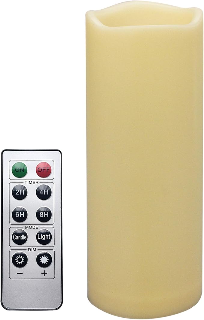 - 【Easy to use with remote】The remote has a 10-20 foot range. You can use the remote control to turn on and off the flameless LED candle, set the timer (2H, 4H, 6H and 8H daily cycle timers are available), select the mode (flickering or steady light) or choose the brightness level. Set 4H timer, the candle light stays on for 4 hours and turns off automatically for 20 hours and then on again itself on the second day.