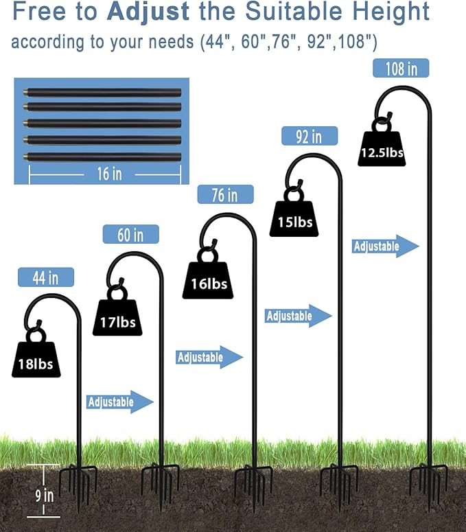 - Super Easy to Assemble & Use: The freestanding 108 inches shepherds hook is quite easy to install or remove down, it comes with 1 base prongs, 1 "S" hook and 5 high-quality steel pipes, each part can be screwed together quickly, no extra tools or accessories needed, just easily place it into the soil or sand with the points.