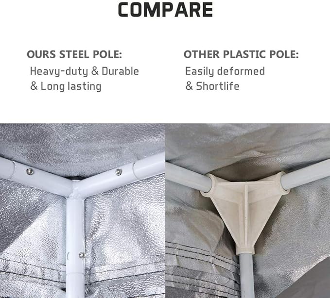 - Tough Canvas & Durability- 600D material is tear proof and double stitched for perfect light blocking .Thick materials and durable zippers to make it a long-term use. It is is tear proof and water-resistance. Metal bars and metal connectors. Strong metal poles with easy click connector system. Our grow tent stands solidly
