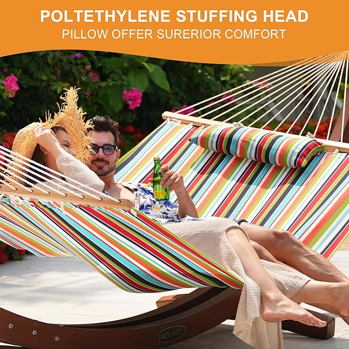 - LAZY DAZE HAMMOCKS: Lazy Daze Hammocks are large enough to accommodate 2 people. The hammock bed size is 77 inches x 55 inches. A 12-feet hammock with 2 steel chain links. Double hammock with wood spreader bar, 55 inches durable hardwood spreader bar made of FSC-Certified wood, itโs designed to safely support a maximum capacity of 450 pounds