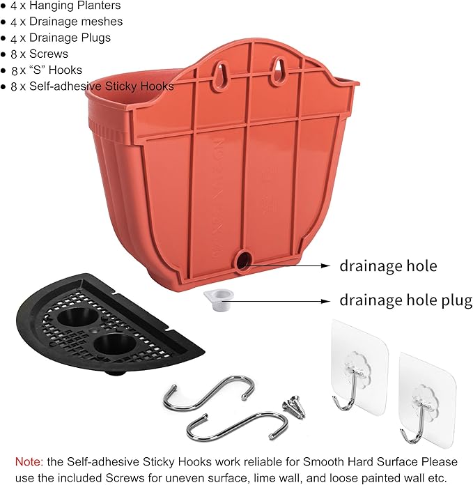 - Indoor and Outdoor Use: Vertical wall hanging planter made of high quality durable PP resin material, safe and non-toxic, this polypropylene resin planter is a tough, lightweight , all-weather durability with UV protection for outdoor use, an alternative to clay or ceramic planters. Pull out drainage plug to allow for the removal of excess rainwater when installed outdoors. Install drainage plug when used indoors. SIZE (L*W*H): 8.1"x4.7"x6.8"; 4 x “S” hooks of stainless steel included.