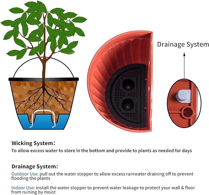 - Planter with Drainage Mesh and Water Reservoir: Hanging planter pots with drainage mesh to allow excess water to store in the bottom of this lazy flower pot and provide to your plants as needed to ensure plants take enough water they need for days, and you don't have to water them frequently. This clever hanging flower pots may help you care your plants when you go outside a couple days or on business.