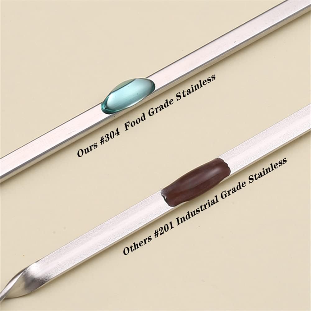 - 🍖【PREMIUM STAINLESS STEEL, PERFECT WORKMANSHIP】Metal kabob skewers sticks are made of premium stainless steel,food grade, rust-proof, heat-resistant, and corrosion-resistant. These heavy duty grill skewers are corrosion resistant and can last long. The edges of the barbecue skewers are well polished, and the metal skewers are safe to use. Metal shish kabab skewer is of solid one-piece design. The Reusable BBQ Sticks are thick enough to allow you to add weight without bending or twisting.