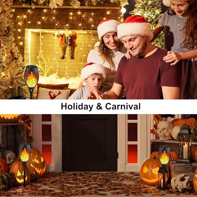 - Flame Torches Flickering Flames: Solar outdoor lights outdoor decorative flicker a soft and mod-enhancing "Real" flame for outside decorations for patio, yard, porch, pool,garden decor and for party, camping, barbecue, wedding, christmas, halloween decor.