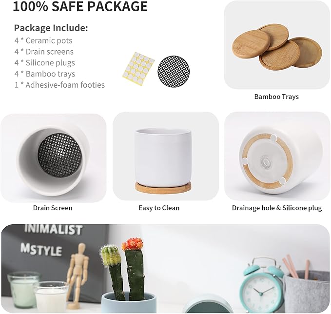 - Drainage Holes - The ceramic flower pots with drainage holes that allows excess water to flow out, thereby prolonging the life of the plant. The pots for plants with bamboo saucers really a great decoration for your desk. You can also use them without the saucers.