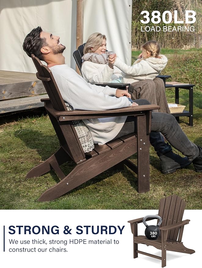 - Weatherability Material- KINGYES adirondack chair is made of Polyethylene (HDPE) for exceptional durability, feel like waxy. The Adirondack Chair is built to withstand a range of climates including hot sun, snow and strong coastal winds and it has an excellent fastness to denting, cracking, peeling or rotting. Perfect choice for outdoor patio, fire pit, backyard, garden ect.