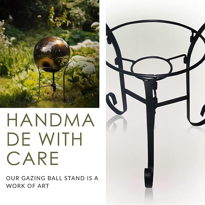 DURABLE AND STURDY - Compared to others, this stand Constructed of durable iron,Metal material resists damage from the elements for years of quality use,Finished with a black powder coating for maximum weather resistance while showing them off for all their styllish beauty. - UNIQUE DESIGN - The gazing ball tripod stand is hand-made by professionals to make a enchanting and unique design. Three forged tabs cradle the gazing ball for delicate support, it has a stem is captured in the tubular section at the top of the stand, ensuring the globe will stay seated in place, Just simple installation can be placed in the garden