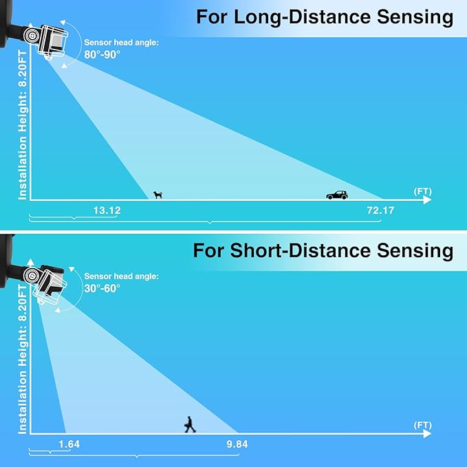 - Adjustable Sensing Mode: You can use the 3 knobs at the back of the sensor to adjust the detection distance, lighting duration and ambient brightness to activate the sensor. Setting the security light to work only at night or both day and night. 180Β° ultra-wide sensing range, 32.8ft sensing distance and 7~420S continuous illumination time provide you with a larger viewing area for an excellent nighttime experience. Tips: Not Solar Powered