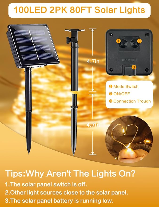 - [Solar Lights Outdoor Waterproof] : Solar fairy lights and solar panels are IP65 waterproof, windproof, snowproof and heat-resistant, so they can be used in rain, snow or hot weather without worrying about short circuits or damage, solar fairy lights are suitable for outdoor use. Solar string lights outdoor waterproof will be a great choice.