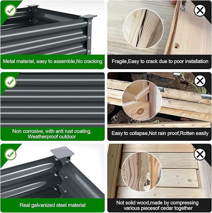 - Unique design: raised garden beds outdoor for vegetables, it is our custom-designed style The upper part of the garden bed is galvanized sheet, the middle bottom plate is a stainless steel shelf, and the lower 4 legs are aluminum alloy legs, which are more durable than wooden and anti-rust performance keeps it in the best condition for a long time. The 4 corners above and below the raised garden bed are protected with pads, which not only effectively prevent sharp corners from poking people, but also prevent the floor from being scratched.. The garden box is exquisite and stylish, it brings great convenience to our planting life.