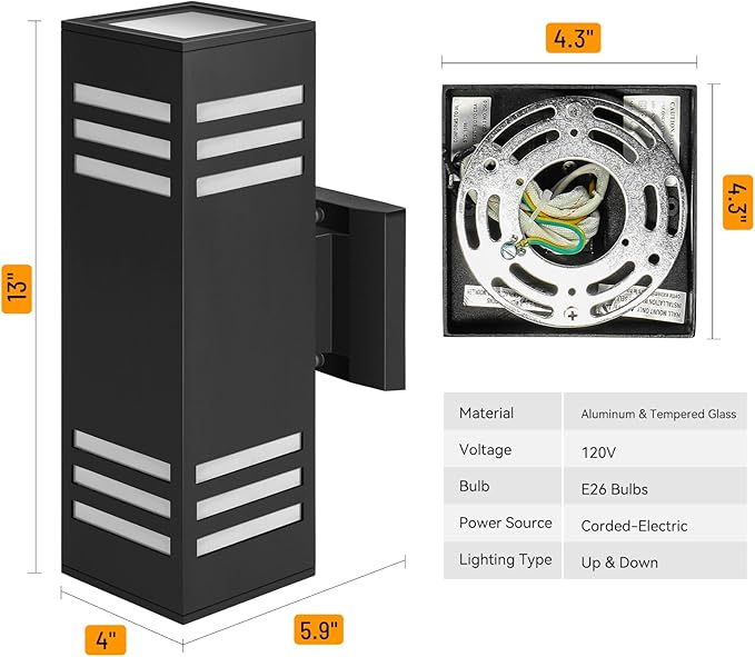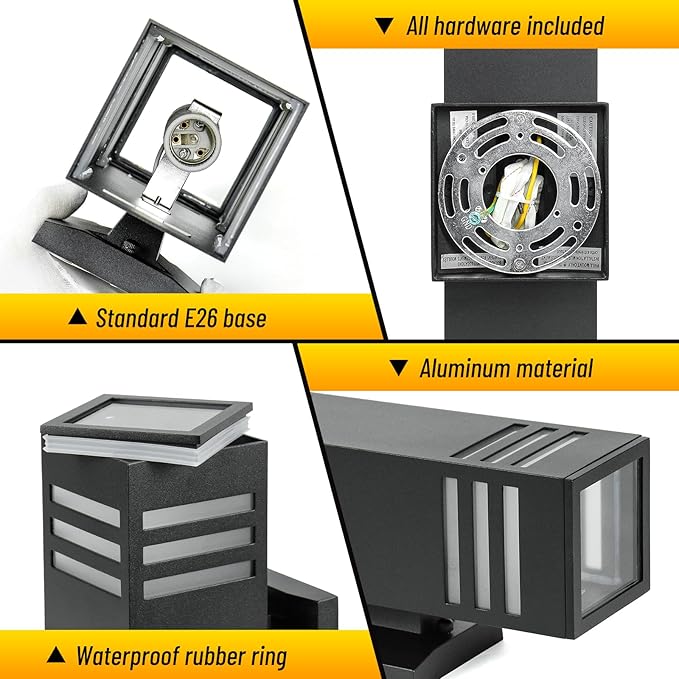 - Outdoor Home Decor: E26 Bulbs included, square shape up and down outdoor wall sconce each face with 3 frosted light transmission barras creates a comfortable and warm lighting effect adding stylish modern atmosphere to your home makes everything different.
