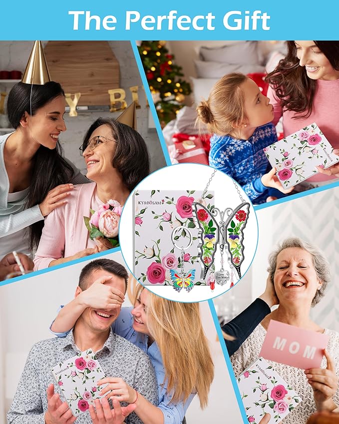 - β€ Attractive and Uniquely House to live in Home decor Designed :Perfect birthday Gifts for Mom from daughter,Mom birthday gifts,Gift for Christmas Motherβs Day,Gifts for women who have everything,God bless mother in-law gifts,Nana Gifts,grandparents day gifts,As a festival gift or decor on Birthday party, Thanksgiving, Valentine`s Day,Stained Glass Panels crystal prism suncatcher for window hangings,Top gifts for women butterflies Mom gifts for daughters garden decor ,and You will receive a Pink rose flower Color Boxes Packing with a Butterfly suncatcher, Painted Enamel Butterfly and a complimentary suction cup with hook, The carries a tag with " I Love You Mom " engraved on it.