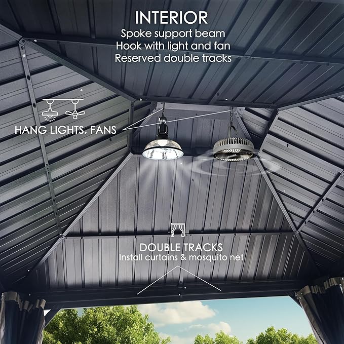 - ✅Curtains and Netting - The hardtop gazebo is equipped with fully enclosed, double-sided zippers, a dual-track system, and double-layer sidewalls. The gray polyester curtains and mesh ensure good ventilation and unobstructed views while offering protection from rain and UV rays, enhancing privacy. This setup creates a safe and comfortable environment for your family.