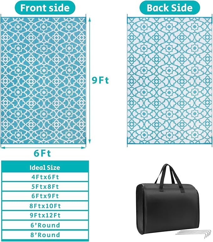 - XL Large Reversible Outdoor Rugs: Featuring a classic moroccan pattern on both sides, this rectangular 6x9 ft outdoor area rug allows you to instantly refresh your patio, porch, backyard, deck, RV campsite. And this outdoor deck rug is reversible, two-sided design allows you to have two different looks,both sides can blend perfectly with nature and look very full and comfortable.