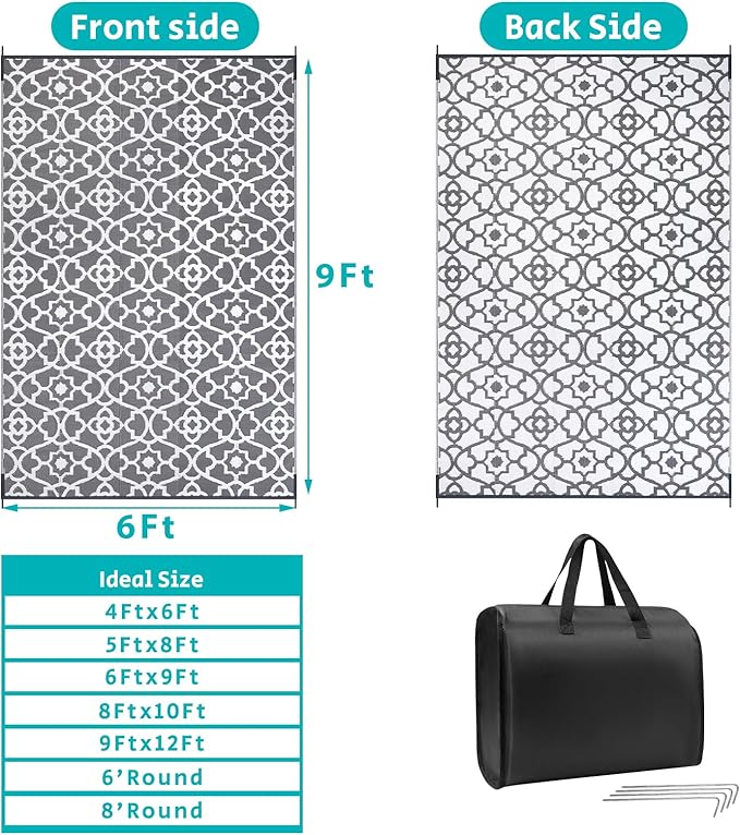 - XL Large Reversible Outdoor Rugs: Featuring a classic moroccan pattern on both sides, this rectangular 6x9 ft outdoor area rug allows you to instantly refresh your patio, porch, backyard, deck, RV campsite. And this outdoor deck rug is reversible, two-sided design allows you to have two different looks,both sides can blend perfectly with nature and look very full and comfortable.