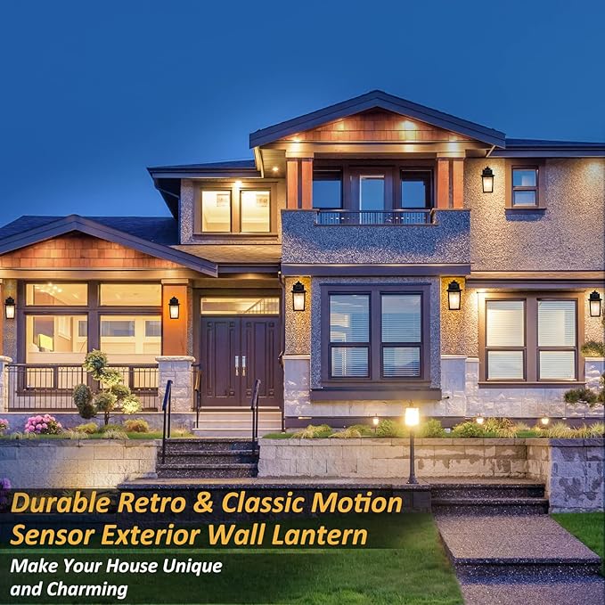 - 【Classic, Modern & Widely Application】The frame of the motion sensor porch light is designed with a simple and modern structure and a textured matte black finish. It is also matched with a unique and delicate glass to emit a charming glow. The dusk to dawn outdoor lighting fixture is so eye-catching whether as an outdoor decor of your house during the day or as an enchanting fixture at night. You won't find any light with such a stylized and flawless look, ideal for a place in doorway, garage