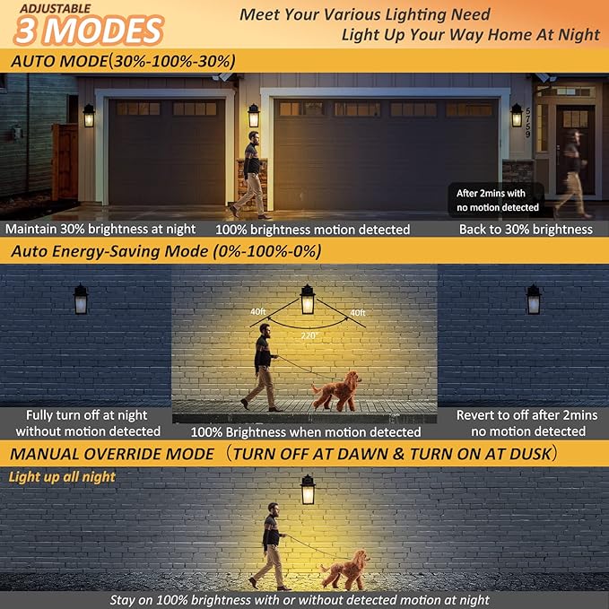 - 【Updated PIR Motion Activated & Dusk to Dawn IC SensorOur high sensitivity outside lights for house can provide smart lighting with 3 modes. Mode①: The exterior light fixture could fully off with no motion detected and turn to 100% brightness once motion is detected at night. Mode②: The outdoor light fixture keep 30% with no motion activated at dusk, activated with 100% brightness, and back to 30% brightness after 120s. ③Manual override mode which can stay 100% brightness at night for 8 hours.