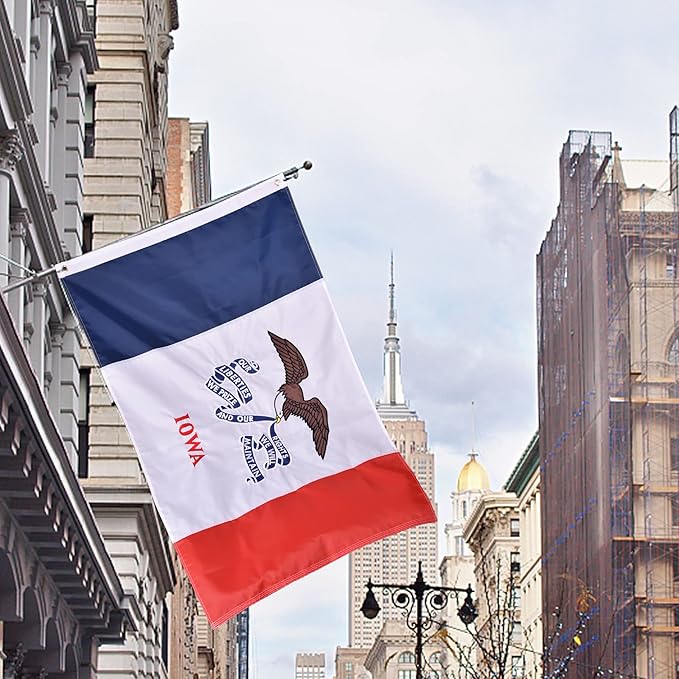 - Strong, Durable: 5x8 IOWA flag outdoor heavy duty, Four Point Needle Fly Hem (4 rows of stitching), 3 Brass Grommets. Fly your big IOWA Flags for outside 5x8 proudly in the rain, snow, high winds and sunshine! The perfect all weathers, Indestructible American IA State Flags for outside banners