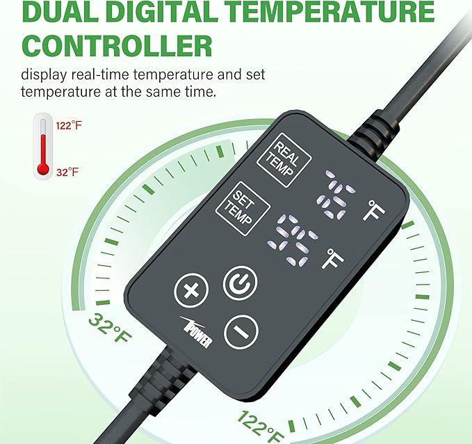 - Dual LED Thermostat: Simultaneously display the real-time and set temperature, which can be adjusted to the required temperature more accurately, a widely range of temperature 32℉~122℉making it the best choice for temperature-sprouting seeds.