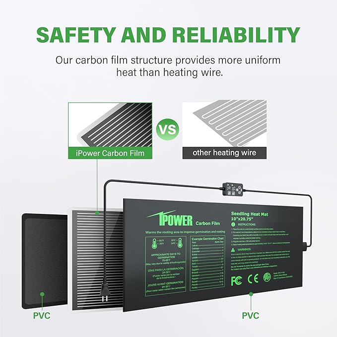 - Heating film structure: heating film ensure uniform heating. Warms root area 10-20℉(5-11℃) over the ambient air temperature, which will increase the success of seedlings and cuttings.