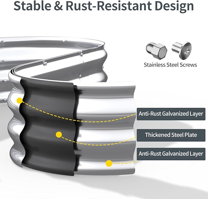- Raised Garden Bed Kit: This raised garden bed kit is made of double-layer galvanized metal sheets with anti-rust coating for stability and rust resistance.
