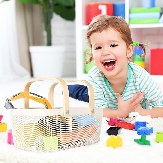 - PRODUCT SIZE: Fruit basket.Material: Metal + Bamboo. Size: 15.7x9.8x6.7 inches.This mesh basket with folding handle helps us keep our closets organized and takes up minimal space while storing many items.In addition,the wire basket of the garden harvest basket is highly breathable,light when empty,and easy to see when picking and placing items.