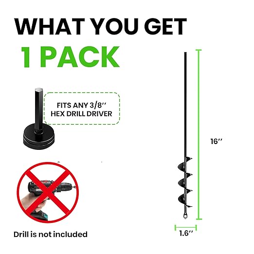 - Includes 1 Inch x 16 Inch Auger Drill Bit (Drill Not Included): Experience effortless digging with our high-quality auger drill bit! Simply attach it to any standard 3/8” hex bit drill, hold with both hands, and enjoy the ease of creating perfect postholes by digging down smoothly and reversing the drill to pull the soil back up