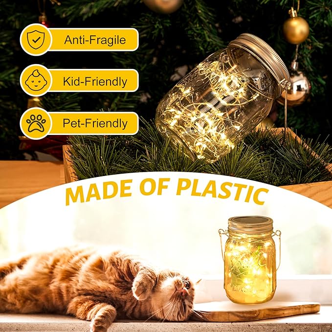 - Safe and Waterproof: Solar powered, easy to use, no wires required, no extra bill. Good heat dissipation, cool and safe to touch without risk of burns; The solar mason jar lights are waterproof, so there is no need to take inside during rainy or light snow days but cannot be totally submerged in water; Great for indoor and outdoor use; Perfect for wedding, party, BBQ, picnic, home, balcony, fence, driveway, garden and tree decor, the night looks with jars of "fireflies" lighting up your space