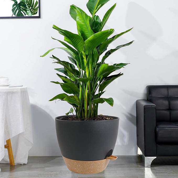 12 inch Large Self Watering Pots, Plastic Planters with 60oZ Removable Deep Reservoir and Multi Mesh Drainage Holes for Indoor Outdoor Garden Plants and Flowers, Black with Brown