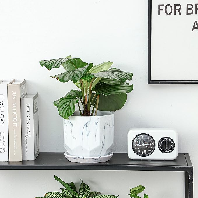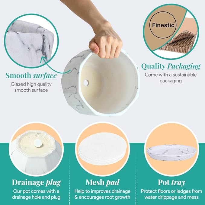- [WHAT MAKES IT PREMIUM PRODUCT] Finestic planters are not ordinary plant pots. Pots are designed locally in the US and made with the best manufacturing standards. Hand Glazing with Marble Pattern takes twice the cost and effort than regular ceramic pots. Pot comes with saucer matching tray, drainage hole, drainage plug, and mesh pad. Higher thickness and sustainable packaging are another addition to the premium offering.