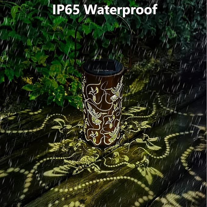 • Graceful Decorative Design - The retro appearance, with gold copper color and hollow out metal veneer, the solar outdoor lanterns casts bright and warm light in darkness, accompanied by gorgeous and graceful hummingbirds patterns, adding a beautiful atmosphere to the surrounding environment.