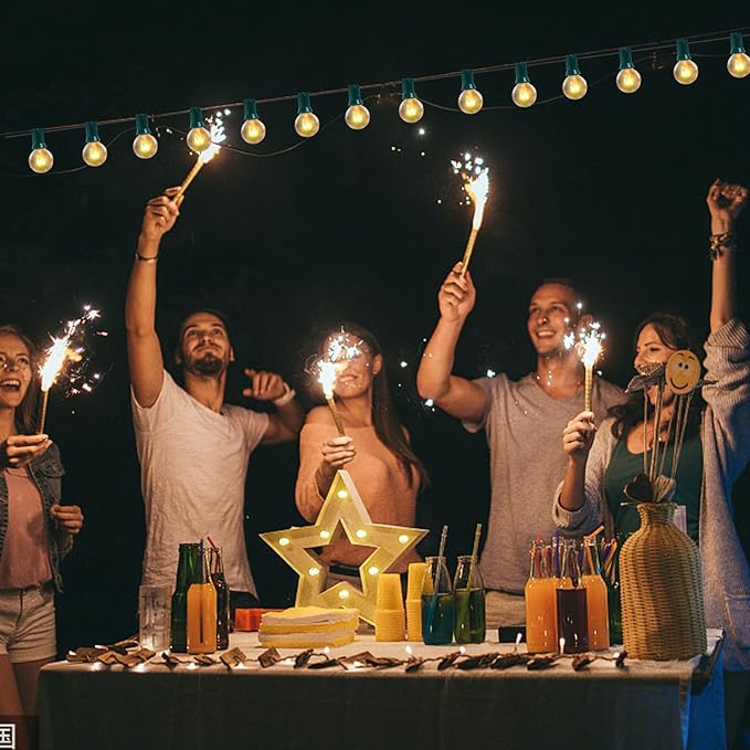 - Outdoor String Lights: 25 Feet Christmas outdoor string lights with 27 G40 clear incandescent bulbs(2 spare), globe light bulbs are 2.36" tall by 1.57" wide, G40 Outdoor string lights have E12 candelabra socket base for Indoor home Outdoor patio decor.