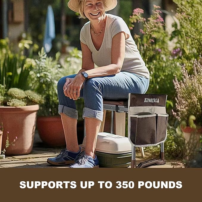 - Unbreakable, Foldable, and Ready-to-Go! Our garden kneeler is as sturdy as your grandma's oak tree swing, supporting up to 350 pounds with ease.. It's ready-to-use, no assembly required β just unfold, and voilΓ ! And, guess what? It's not just a kneeler; it's a garden stool too! Snap-lock it, and you're all set for a throne-like experience. Aimerla Kneeler: making gardening chic and a breeze. Aimerla Kneeler: making gardening chic and a breeze
