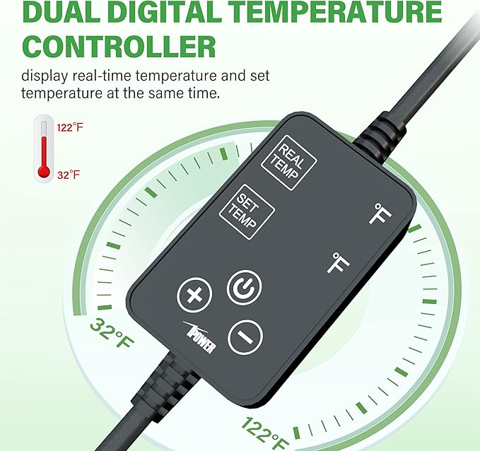 - Dual LED Thermostat: Simultaneously display the real-time and set temperature, which can be adjusted to the required temperature more accurately, a widely range of temperature 32℉~122℉making it the best choice for temperature-sprouting seeds.