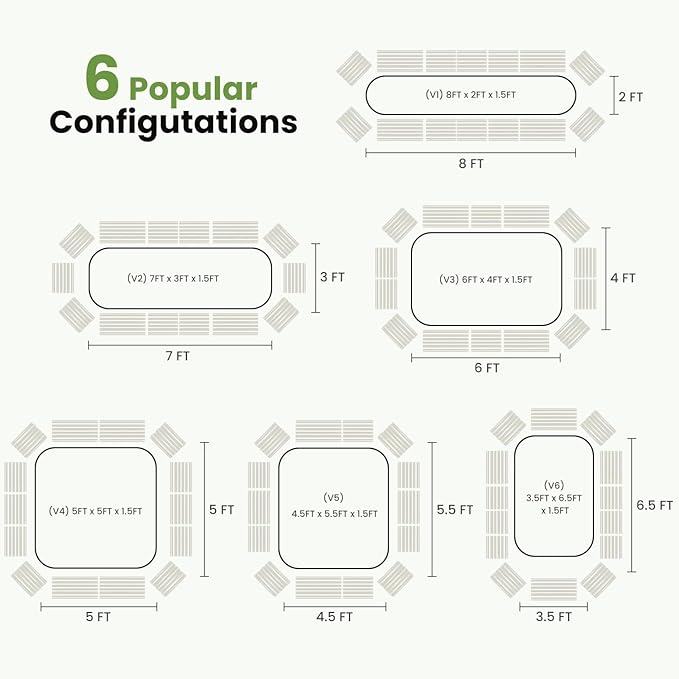 - Standard size and popular color: The raised garden bed is 8x2x1.5ft, with 4 bent panel, 6*1FT and 4*1.5FT straight panels. You can assemble them into 31 possible configurations to fit your plants, and choose your optimal configuration based on the layout of your gardening area. Two steel support bars help the panels keep their shape, preventing warping and soil leakage over time.