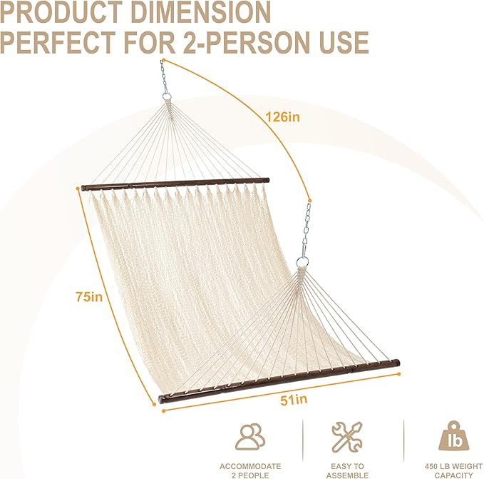 - Whatβs In The Package: 1 Caribbean rope hammock is included in the package (Hammock stand not included) and two chains; Hammock with stylish vintage hardwood spreader bars creates a safer zone for you, 51 inches durable hardwood spreader bar made of FSC-Certified wood; It's easily hanging between two trees or a hammock stand with an "o" ring at each end