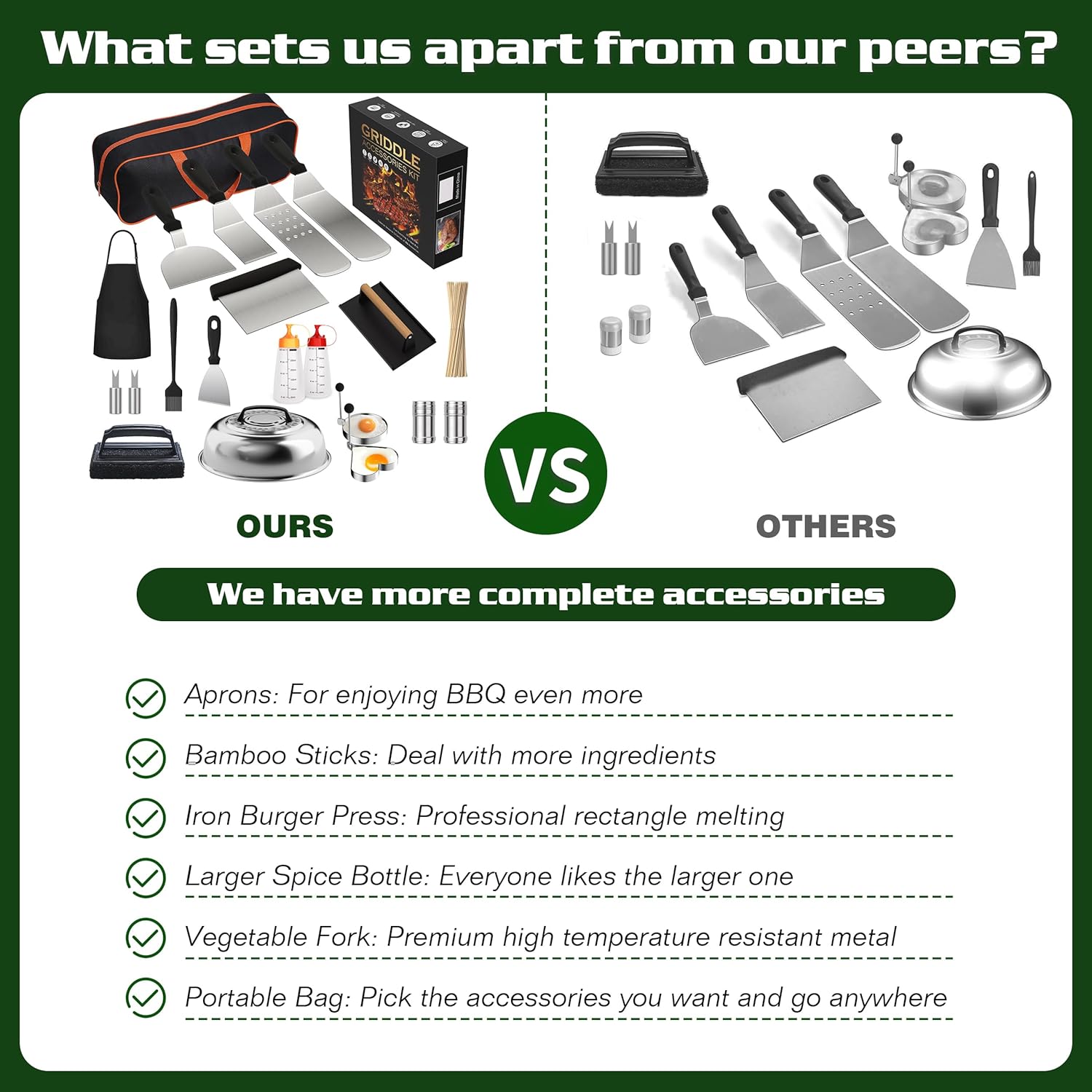 - 【Premium Quality】: Our Furnhome 120pcs Griddle Accessories Kit is crafted with heavy gauge stainless steel, ensuring durability and long-lasting performance. You can trust that our BPA-free, rust-resistant, and durable tools won't crack or melt with long-term use. Say goodbye to flimsy tools that bend or break easily during outdoor grilling sessions.