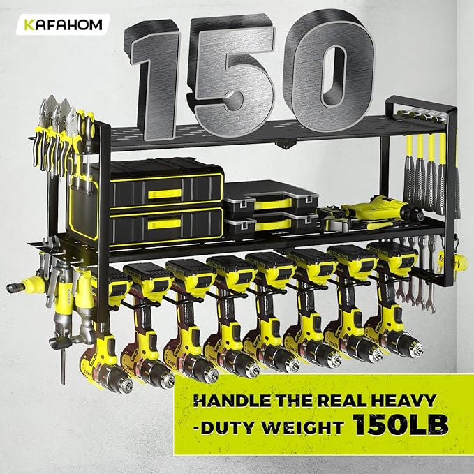 - Sturdy Construction: KAFAHOM power tools rack is built the 3 tiers with durability and stability in mind. The top tier is constructed with an iron plate for superior load-bearing capabilities, supporting up to 150 lbs.