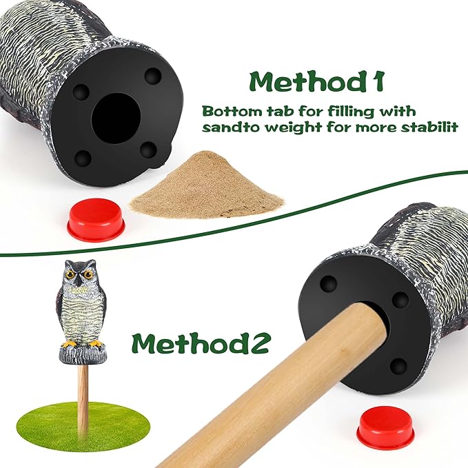- Easy to Install and Move: The owl scarecrow has an anchor and can be easily fixed on a stick or pole. You can also fill the bottom with sand for stability. Easily placed or moved anywhere in gardens, patios, porches, orchards and barns. Very simple to install, no complicated setup or tools required, saving you time and energy.