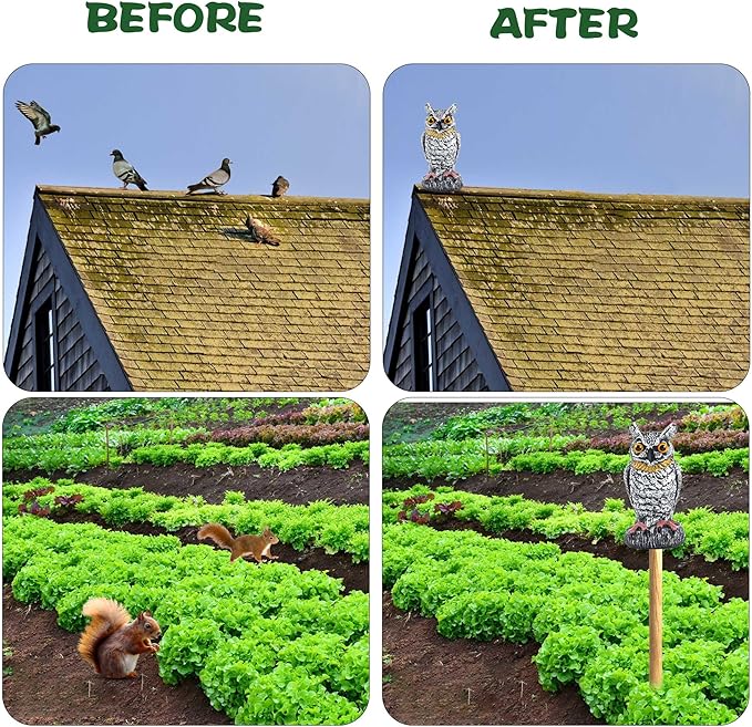 - Effectively Keep Birds away without Harming Them: The lifelike fake owl statue can easily scare away birds, sparrows, woodpeckers, pigeons, seagulls, squirrels, snakes, raccoons, rabbits, etc., without causing them harm. Keeping the balcony, roof, swimming pool, corridor, deck and garden tidy and clean.