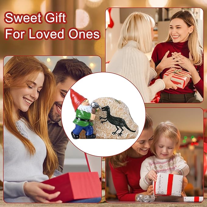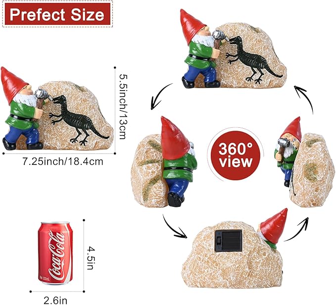 - 【CUTE GNOME STATUE】This garden gnome statue holds a hammer and carves a dinosaur on a solar resin stone,this solar garden archaeology gnome statue is a great decoration to yard,flowerbed,walkway,patio,lawn.light up warm lights every night to welcome your family or friends, add some wonder and charm to your garden