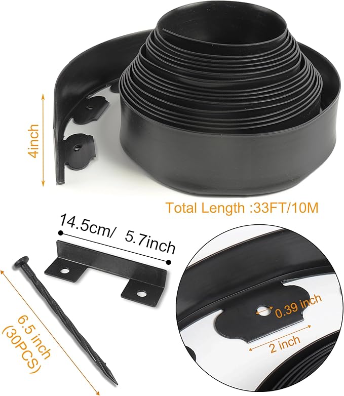 - What You Get: The border edging kit includes one roll of 33 ft length, 4 inch height black plastic lawn edging for effective landscaping, and 30 pegs measuring 16.5 cm in length to assist in maintaining its shape