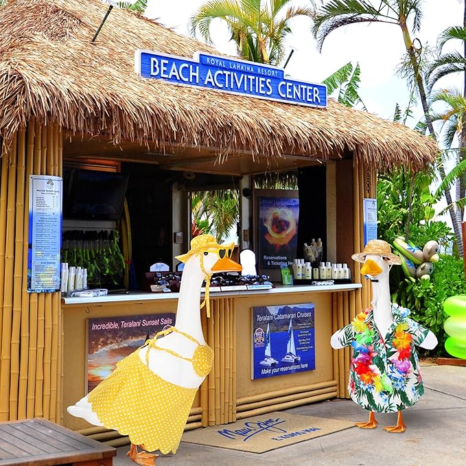 - Convenient Package Inclusion: our 23'' goose outfit package comes with 1 Hawaiian shirt, 1 bikini set (includes 1 hat, 1 bikini, 1 skirt), 1 hat, 1 pair of sunglasses, and 1 Hawaiian wreath; Please note that while the outfit comes with numerous accessories, the lawn goose itself is not included, allowing you to apply it to an existing statue or find one that suits your preferences