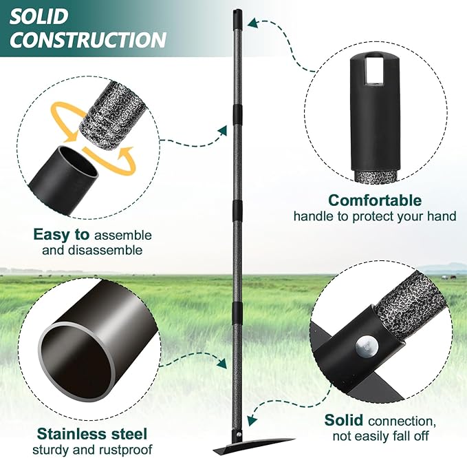 - Adjustable Handle Length: The weeding hoe's handle can adjust to 60" to accommodate gardeners of different heights. The ergonomic long handle can help protect your back and waist by reducing the need to bend. Length adjustment is quick and easy, just add or remove extension rods!