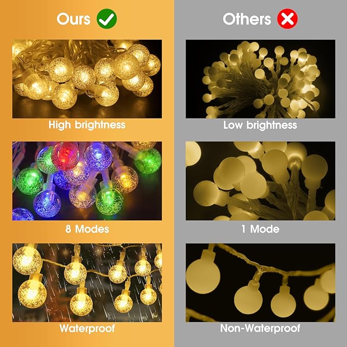 - Upgraded tring Lights:45.9 feet outdoor string lights with 140 Super Bright LED crystal globes. Each globe has a diameter of 17.5 mm, which is much larger than the others. What is the difference? Means you can get higher brightness and more gorgeous lighting effects. Unlike other black wire fairy light, this battery string lights use transparent tube to wrap string, making it consistent with the crystal ball style, which is not make people feel weird
