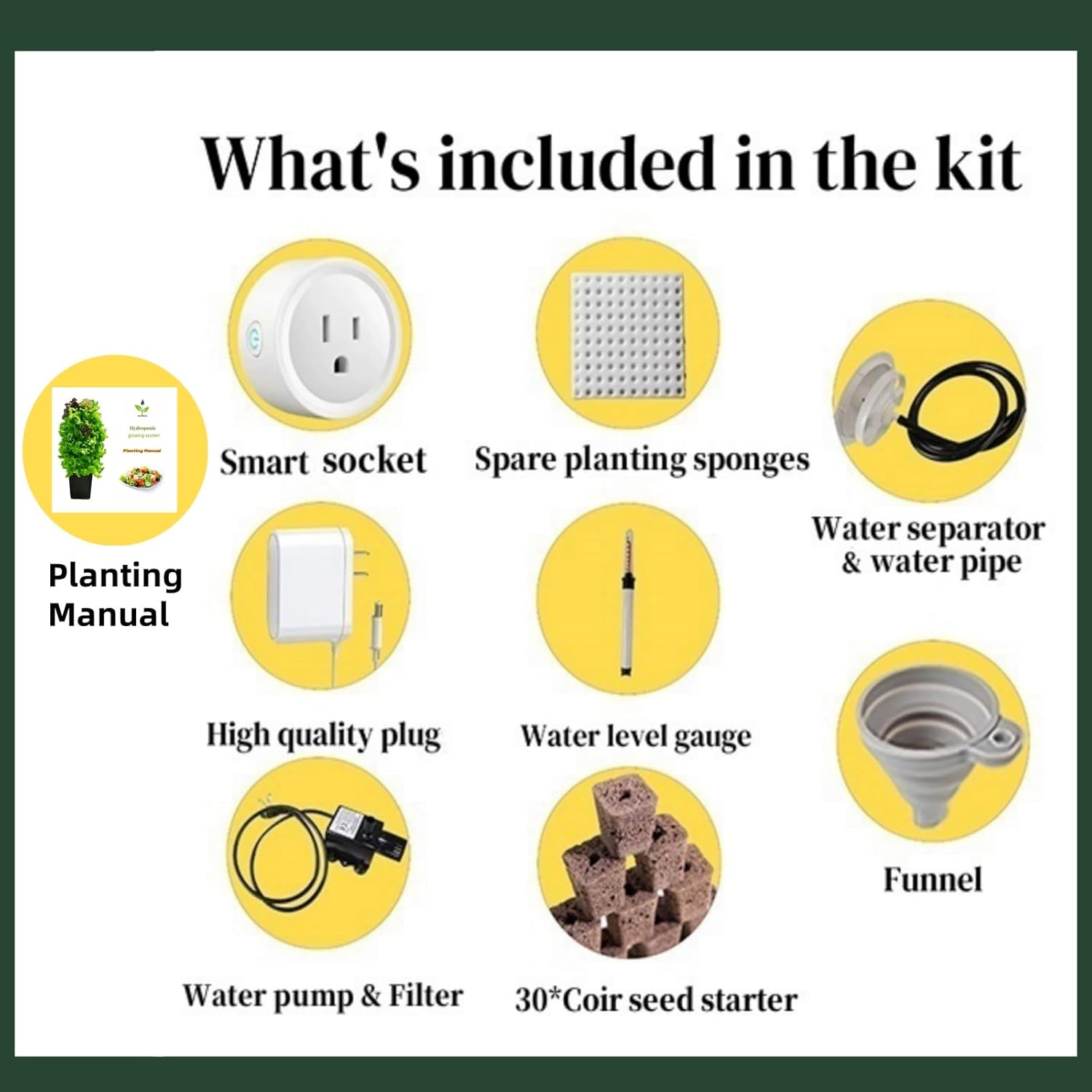 - This hydroponic indoor gardening kit includes: a silent water pump, smart socket, 30 coconut seed starters, a planting manual, water level indicator, funnel, and spare planting sponge 64pcs.Please note that seeds and plant food are not included.